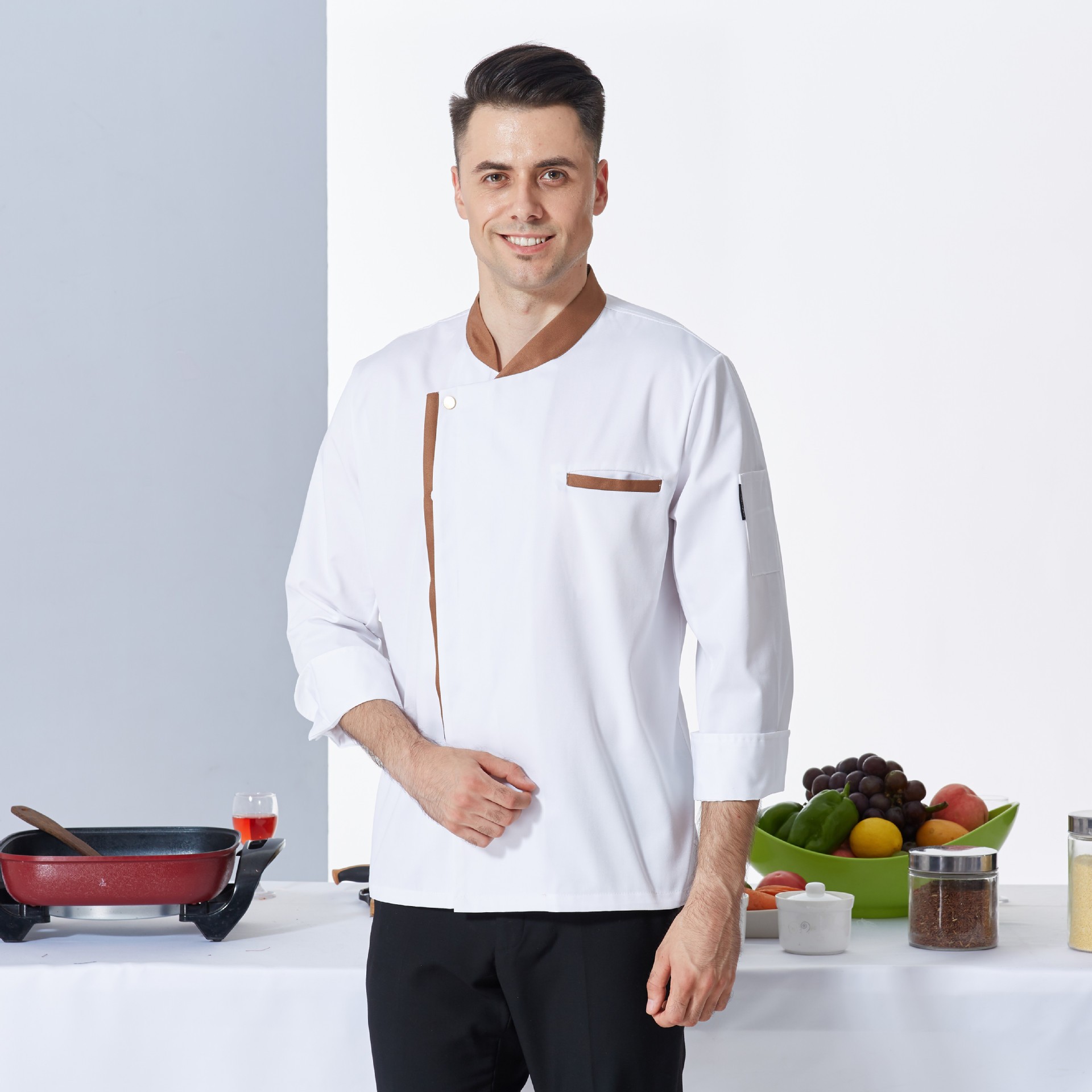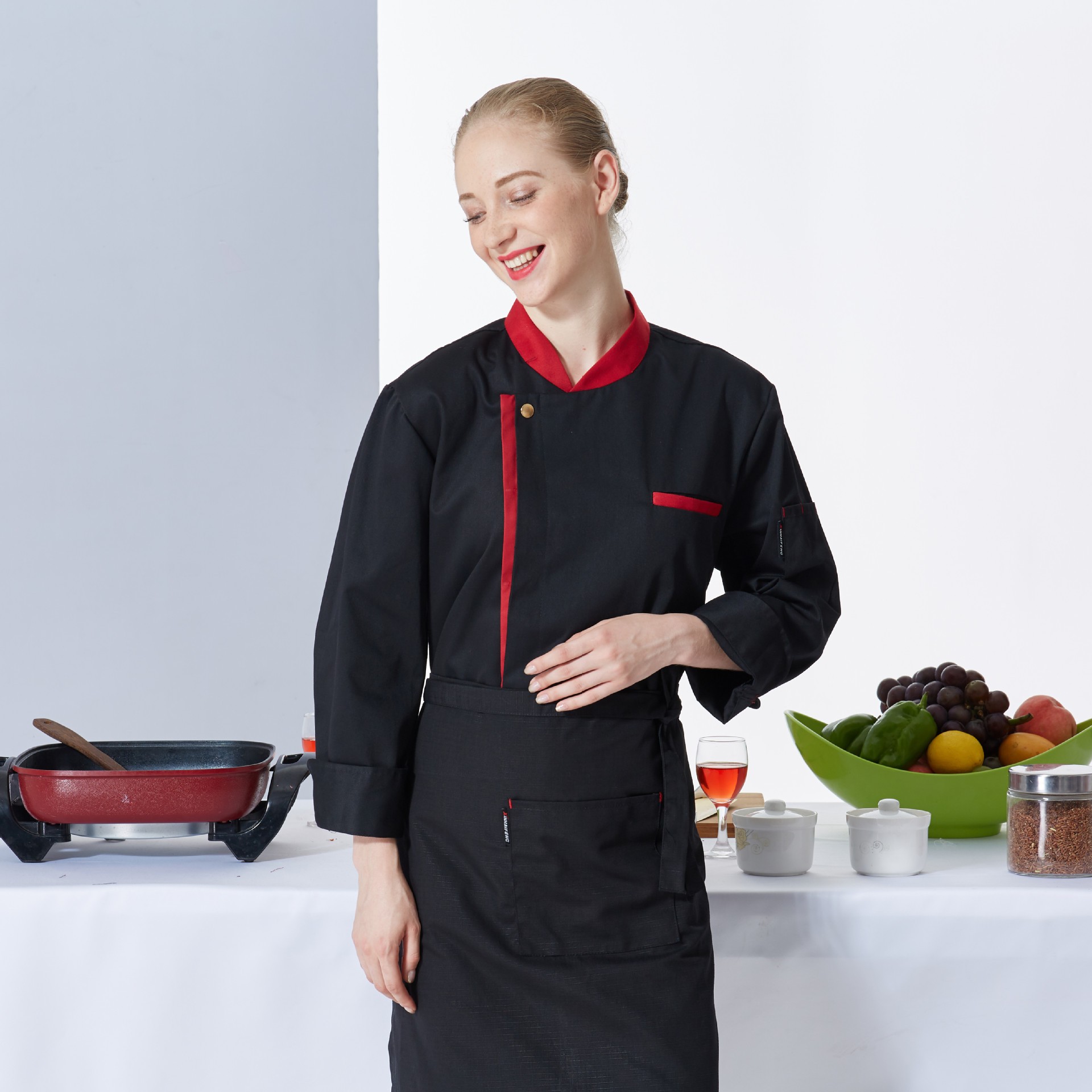 This fashion-forward chef uniform series combines sophisticated color blocking with traditional functionality, creating striking visual appeal while maintaining full professional performance for modern culinary environments.